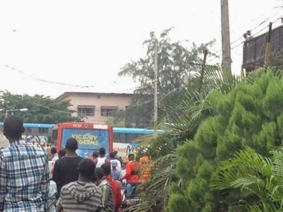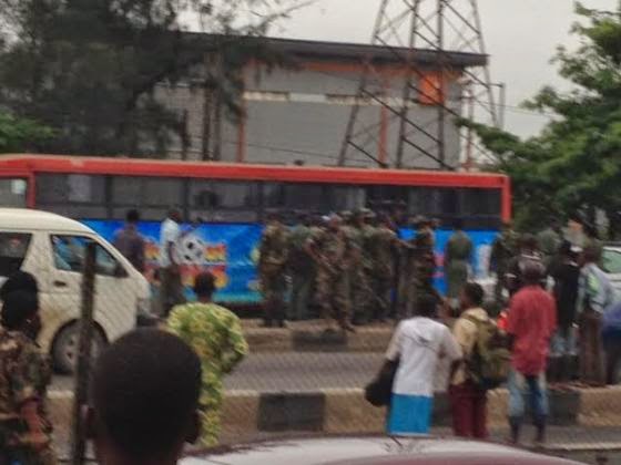 Some soldiers are currently causing chaos in the Palmgroove area of Lagos. An eye-witness said trouble started when a BRT bus hit a soldier on a bike. Nobody knows if the soldier died (though there are indications that he may have been crushed to death) but other soldiers immediately arrived the scene and started stopping all BRT buses on Ikorodu road beating drivers and sending passengers out. Beating even passers-by who move too close to them or take pictures.